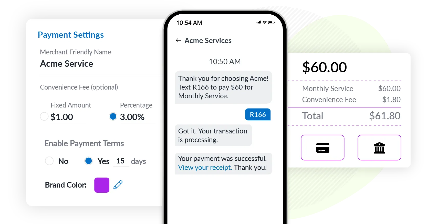 Convenience Fee: The convenience fee is a way for you to charge your customer a set fee for the convenience of paying over text message. For example, if you set your fee at $5, and your client owes $100, then your client will pay $105 to your business. Your convenience fee can also be set to a percentage of the price.